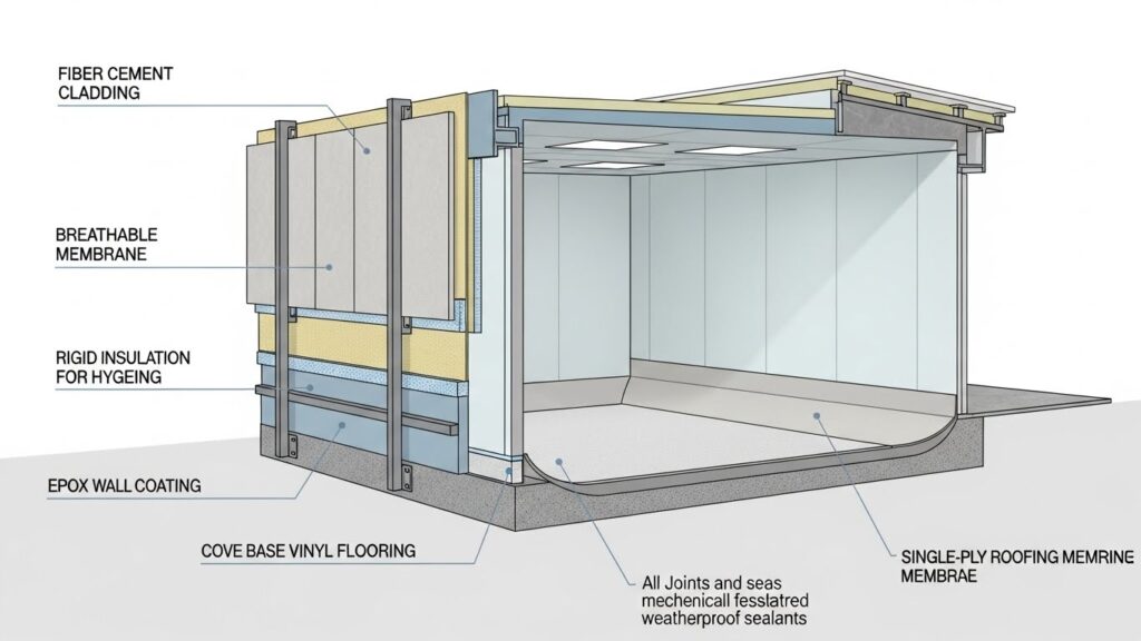Exterior finishes are weather-resistant, while interior surfaces are designed for easy cleaning and hygiene, especially for hospitals and clean environments.